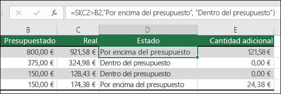 En el ejemplo anterior, la función en D2 dice SI(C2 es mayor que B2, devolver "Presupuesto excedido"; de lo contrario, devolver "Dentro de presupuesto")